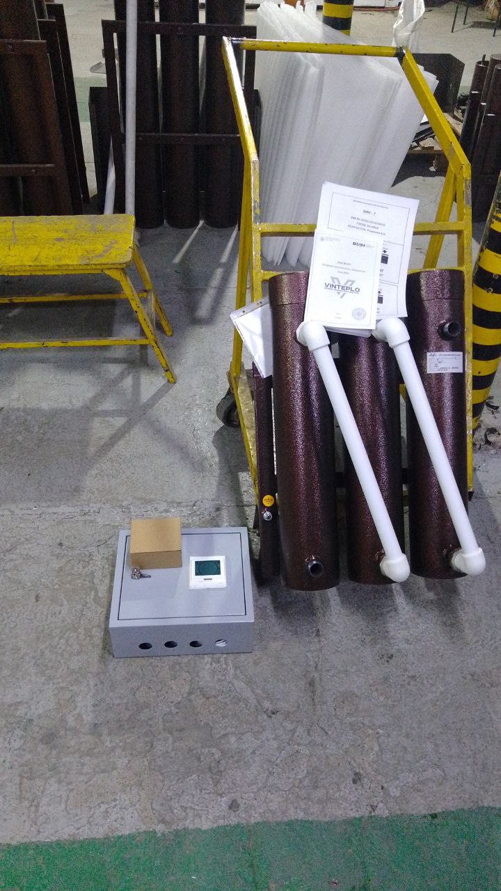 Вихревой индукционный нагреватель мощностью 20 кВт, работает от трехфазной сети 380 В. Нагревает теплоноситель до 95°С, при максимальном рабочем давлении системы до 3 МПа. Диаметр присоединительных патрубков 25 мм. Сечение одной жилы медного силового кабеля, не менее 10 мм².
